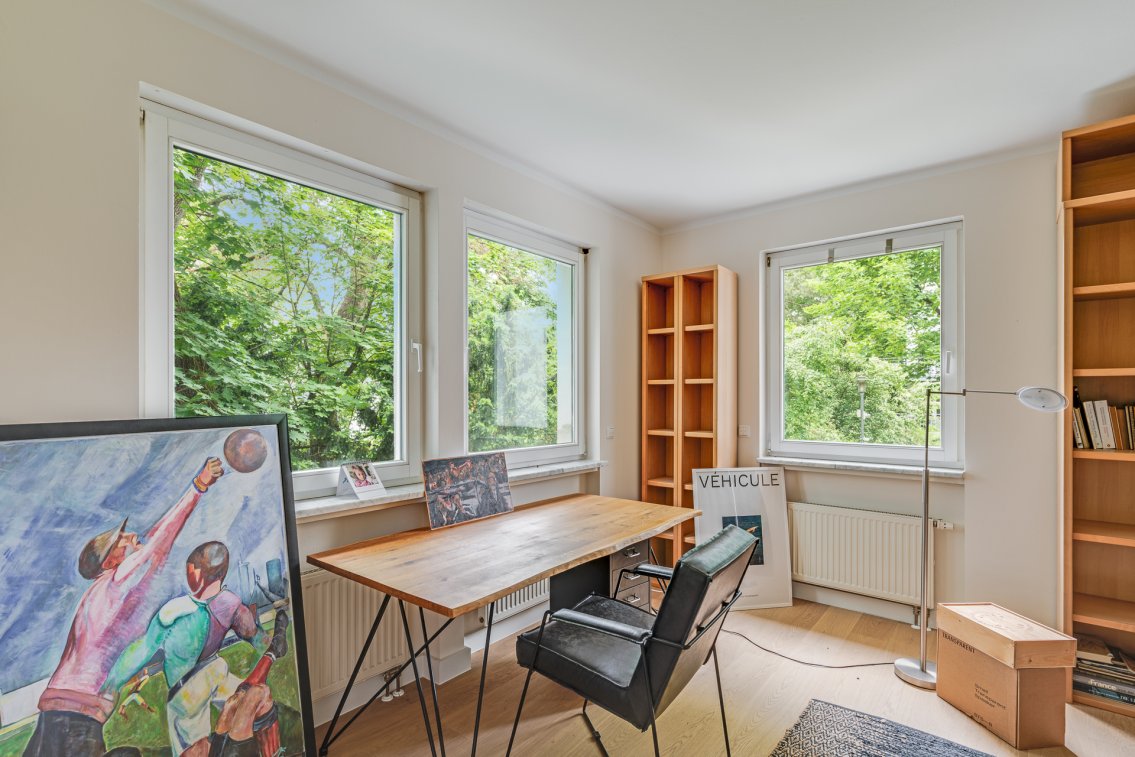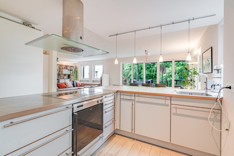 Der weitläufige Wohn- und Essbereich ist lichtdurchflutet und sorgt für eine einladende Atmosphäre. Hochwertiges Echtholzparkett und eine moderne, offene Küche unterstreichen den gehobenen Wohnstandard. Vier Balkone bieten Ihnen zu jeder Tageszeit die Möglichkeit, die Sonne zu genießen, während an kühleren Tagen der Kamin wohlige Wärme spendet. Sie profitieren von einer idealen Kombination aus Naturverbundenheit und Stadtnähe – ohne Kompromisse.