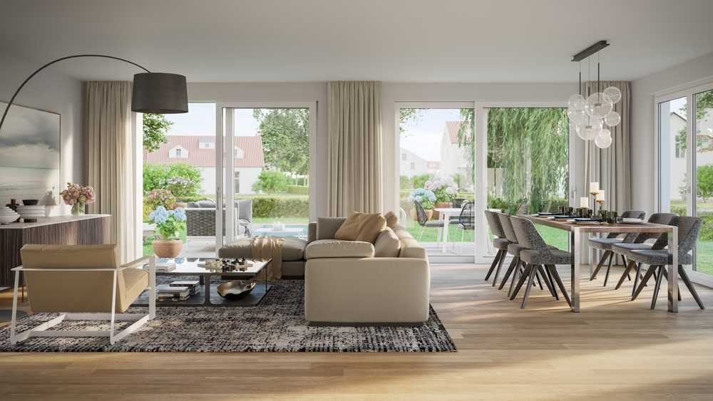 Im Erdgeschoss öffnet sich der großzügige Wohn-, Ess- und Kochbereich zu einem lichtdurchfluteten Lebensraum, der zum Mittelpunkt des Alltags wird. Große Fensterflächen schaffen ein helles, freundliches Ambiente, während die offene Architektur für ein Gefühl von Freiheit und Großzügigkeit sorgt. Die moderne Küche fügt sich harmonisch in das Wohnkonzept ein – ideal für gesellige Stunden mit Familie und Freunden. Ein Gäste-WC sowie ein praktischer Technik- und Hauswirtschaftsraum ergänzen die untere Ebene perfekt.