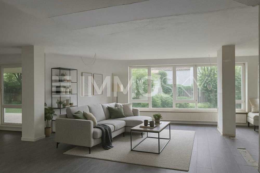 Das Herzstück der Wohnung bildet das sehr großzügige Wohnzimmer, das durch eine gemütliche Geseke stilvoll unterteilt ist und zum Entspannen und Wohlfühlen einlädt. Die offene Küche bietet viel Platz und wird komplett neu und modern ausgestattet - hierbei haben Sie aktuell noch die Möglichkeit, die Farbe und Ausstattung individuell mitzubestimmen.