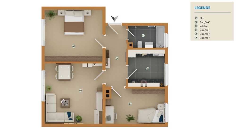 Das Wohnzimmer ist der größte Raum der Wohnung. Der Boden ist mit einem Teppichboden in einem warmen Farbton ausgelegt.