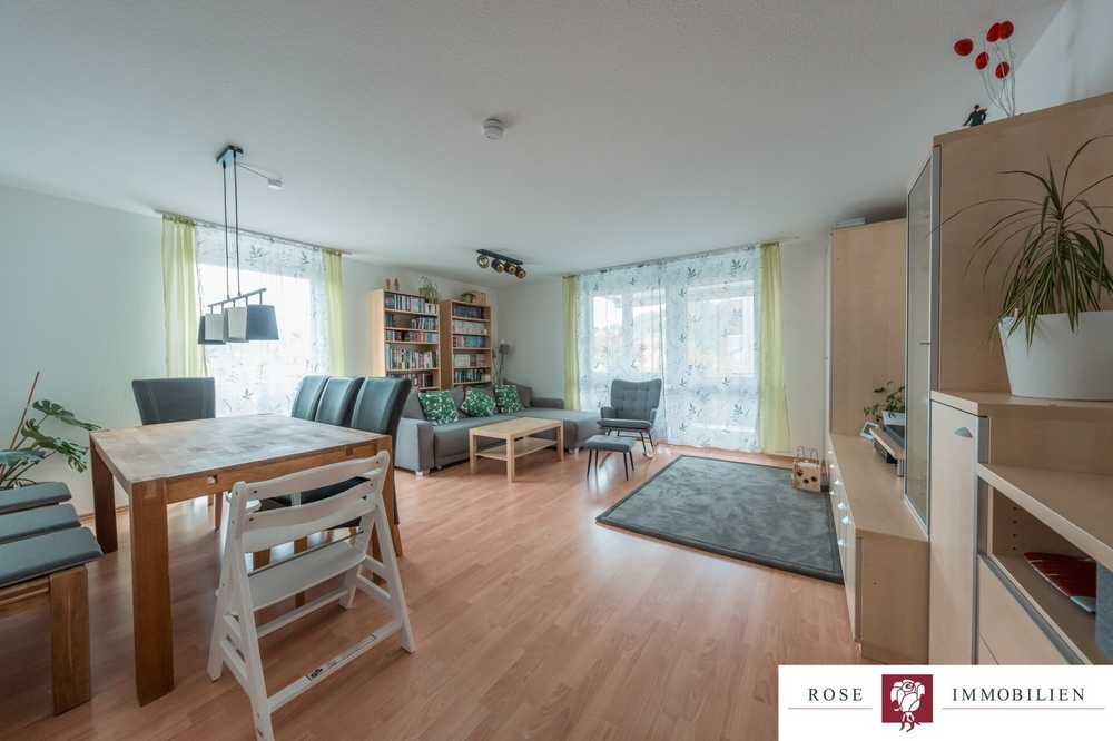 Die Wohnung liegt in einem Mehrfamilienhaus mit Aufzug und ist barrierefrei zugänglich. Der großzügige Wohn- und Essbereich bildet das Herzstück der Wohnung. Durch die großen Fensterflächen gelangt viel Tageslicht in den Raum, was eine angenehme Wohnatmosphäre schafft. Vom Wohnzimmer aus haben Sie Zugang zum überdachten Südbalkon, der ausreichend Platz bietet.