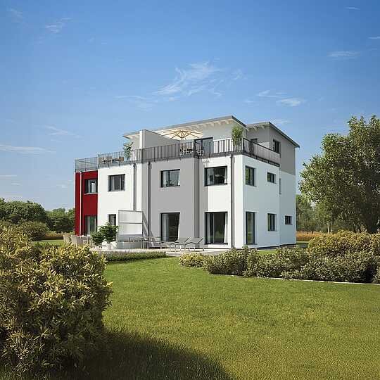 Durch das 2. Obergeschoss entsteht nicht nur eine großzügige Dachterrasse mit herrlichem Ausblick, sondern auch ein zum Beispiel als Arbeitszimmer, Heimkino oder Hobbyraum nutzbares Studio.
