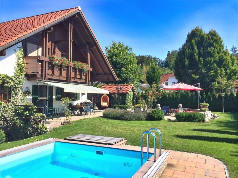 Vom Wohn-Ess-Bereich aus öffnet sich der Zugang über zwei Seiten in den herrlichen Garten - ein Ort der Entspannung und Erholung! Ein großzügiger, beheizbarer Pool mit Abdeckung sorgt für sommerliches Vergnügen. Während Ihre Kinder fröhlich im Wasser und im Garten spielen, können Sie entspannte Barbecue-Abende mit Familie und Freunden genießen. Rund ums Haus verteilen sich mehrere Terrassen sowie ein sonniges Rondell, umspielt von einem kleinen Bächlein. Zwei Gartenhäuser und ein praktischer Holzunterstand ergänzen die Außenanlagen perfekt.