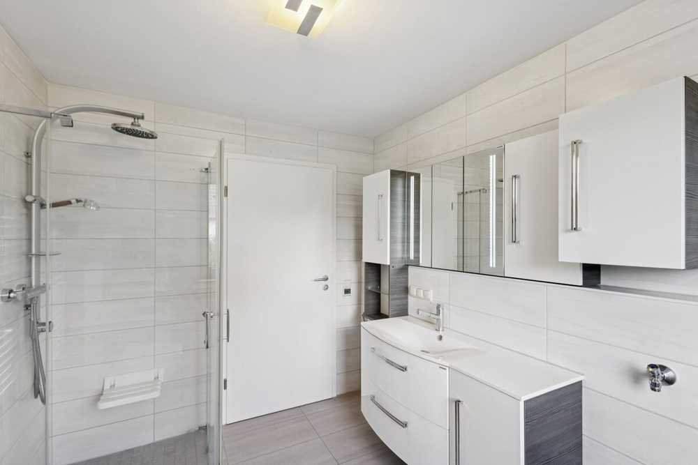 Die moderne Einbauküche (Baujahr 2015) verfügt über einen praktischen Essbereich und lädt zu gemeinsamen Mahlzeiten oder geselligen Runden ein. Das helle Badezimmer überzeugt mit bodengleicher Dusche, Fenster und zeitgemäßer Ausstattung.