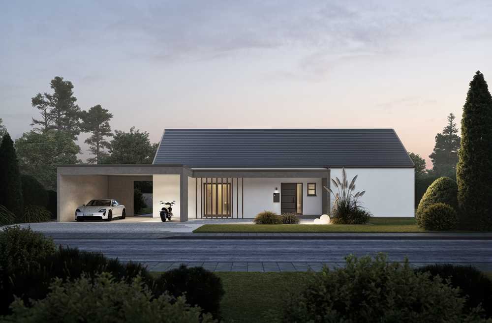 Der elegante Carport mit flachem Dach fügt sich harmonisch ins Gesamtbild ein. Seine offene Bauweise sorgt für gute Belüftung, und die farblich abgestimmten Stützpfeiler verbinden ihn optisch mit dem Haus.