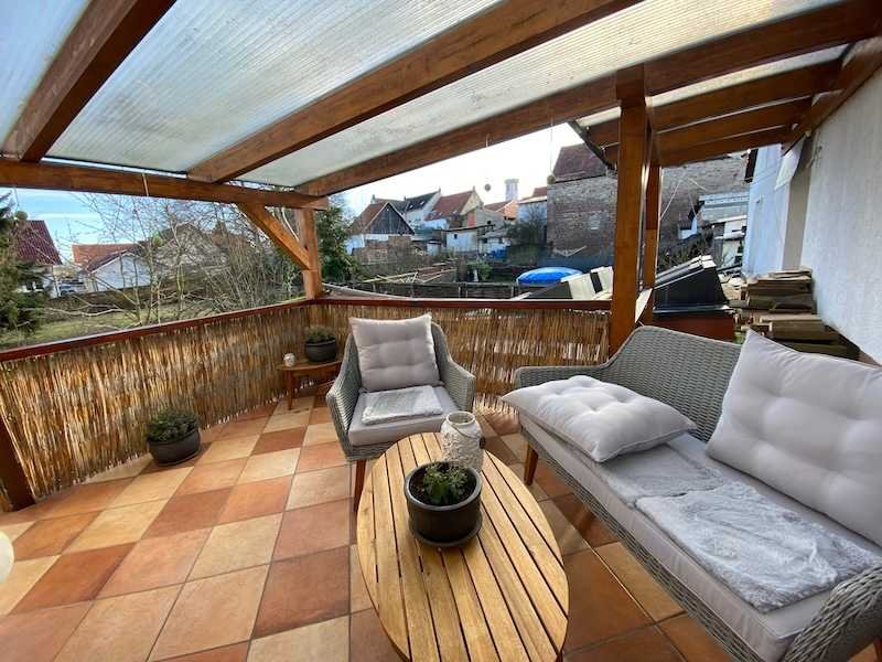 Im Bestandhaus erwartet Sie im Erdgeschoss ein neuwertiger sonniger Wintergarten, eine Terrasse, Wohnküche, Wohnzimmer mit einem Grundofen, Diele und Gästetoilette. Im Obergeschoss des Bestandhauses befinden sich Schlafzimmer, Kinderzimmer, Arbeitszimmer, Bad, Flur und Balkon.