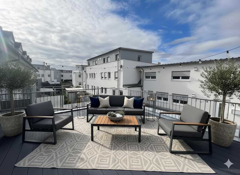 Das weitläufige Wohnzimmer bietet Platz für Wohnmöbel und einen Arbeitsbereich. Eine rund 30 m² große Dachterrasse lädt zum Verweilen ein. Eine hochwertige Holztreppe führt ins Dachgeschoss mit Schlafzimmer sowie Kinder- oder Gästezimmer.