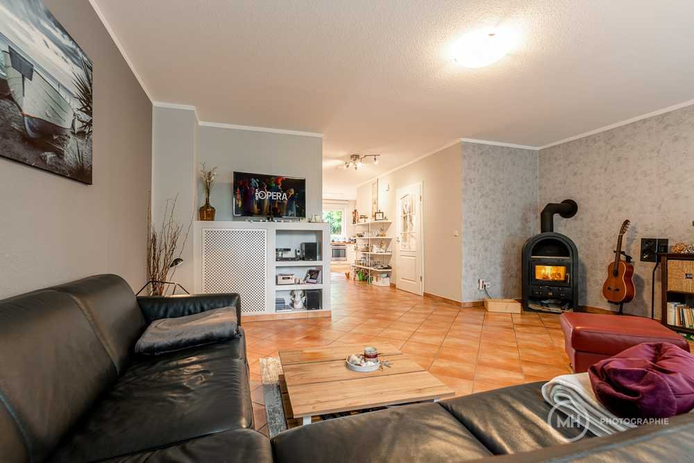 Besonders hervorzuheben ist das großzügige Wohn-/Esszimmer mit Kaminofen – ein echter Wohlfühlmittelpunkt im Erdgeschoss. Dank vieler bodentiefer Fenster sind die Räume lichtdurchflutet und schaffen ein freundliches, warmes Wohnambiente.