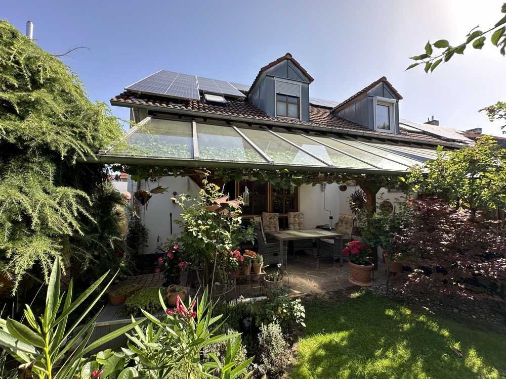Die großzügige Terrasse mit einer Fläche von ca. 15m² lädt zum entspannten Verweilen ein. Eine elegante Pergola mit Glasdach schützt zuverlässig vor Regen, während eine integrierte Markise an sonnigen Tagen für angenehme Beschattung sorgt.