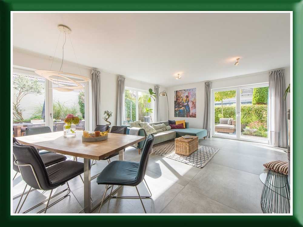2 doppelflügelige, bodentiefe Fenstertüren erlauben den direkten Zutritt zu 2 großen, geschützt liegenden Außenterrassen (Essplatz und Loungeterrasse). Der restliche Garten wurde aufwendig mit hochwertigen Gehölzen wie Kugelplatanen, Säulenbuchen und Felsenbirnen bepflanzt. Hier können Ihre Kinder in der vor Katzen geschützten Buddelkiste oder auf dem Rasen spielen, während Sie sich in den angelegten Hochbeeten aus Edelrost und Massivholz beim Gärtnern verwirklichen. Die moderne Beleuchtung und die vielen Außensteckdosen machen den Garten auch abends zum Wohnzimmer im Freien.