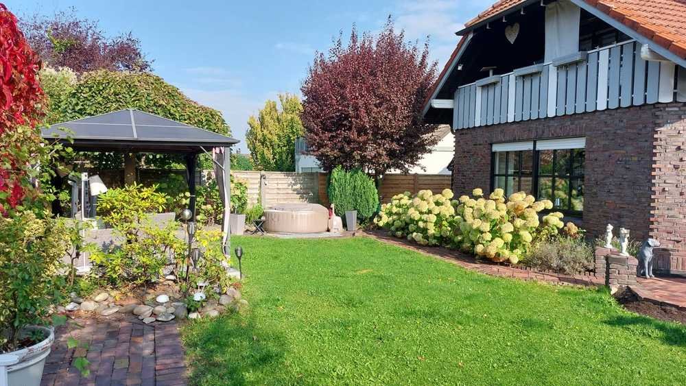 Ca. 120 qm. Das offene Wohnzimmer (40 qm) hat einen direkten Zugang zum Garten. Die moderne Küche ist als Wohnküche gestaltet, mit Einbauküche und Sitzgelegenheiten. Das Bad ist mit Badewanne, Dusche und Tageslichtfenster ausgestattet. Das Schlafzimmer verfügt über einen auf Maß angefertigten Kleiderschrank. Zwei weitere Zimmer sind als Kinder- und/oder Ankleidezimmer nutzbar. Das UG gehört zur EG-Wohnung (Ausn. Wasch-und Heizungsraum) und ist als Wohn-, Büro- und Barbereich, mit großem Stauraum und Gestaltungsmöglichkeiten zu nutzen. Der Barbereich besitzt einen Starkstromanschluss für eine mögliche Sauna. Eine Garage mit eigenem Stromanschluss und der vorgelagerte Stellplatz gehören zur Wohneinheit. Der Garten, mit großer Terrasse, elektr. Markise und zusätzl. Gartenpavillon gehört ebenfalls zum EG