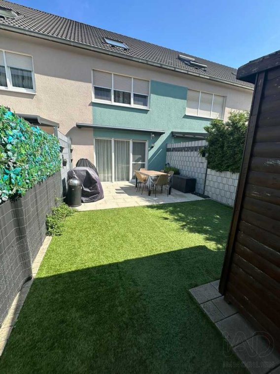 Reihenmittelhaus, massiv gebaut, verputzt und mit Ziegeldach, als Bestandteil einer Häusersiedlung (40 WE) die als WEG geführt wird. Die Wohnfläche beträgt insgesamt 131 m² und besteht aus 5 Zimmern, 2 Bädern, einem Gäste-WC und Abstellraum. Der dazugehörige Grundstücksanteil liegt bei 120m². Der unbebaute Teil des Grundstücks besteht aus einer großzügigen Terrasse ca. 18 m² und einem Kunstrasenstück mit kleinem Gartenhaus. Zum Sondereigentum gehört ein Stellplatz, der im Kaufpreis inbegriffen ist. Außerdem gibt es 2 Garagen, die beide zusammen optional hinzugekauft werden können.