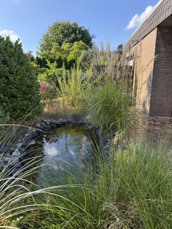Vom Wohnzimmer gelangt der Besucher des Hauses durch eine große Schiebetür auf die Sonnenterrasse und in den gewachsenen Garten mit kleinem Teich und grünem Buschwerk.