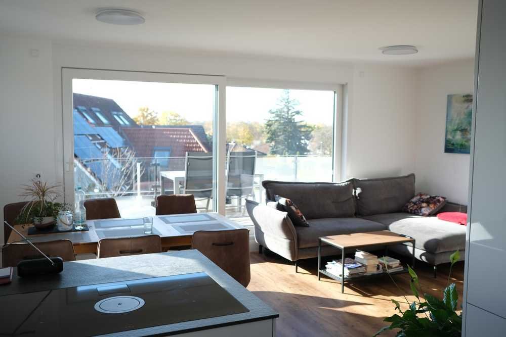 Der Mittelpunkt der Wohnung ist der großzügige Wohn- und Essbereich mit offener Küche. Durch die große Schiebetür zur Dachterrasse sowie die Südwest-Ausrichtung ist der Raum lichtdurchflutet und bietet ein sehr angenehmes Wohngefühl. Die hochwertige Einbauküche (Wert ca. 31.000 €) wirkt modern, ist perfekt in den Wohnbereich integriert und verfügt über sämtliche Markengeräte. Die Küche ist im Kaufpreis bereits inkludiert.