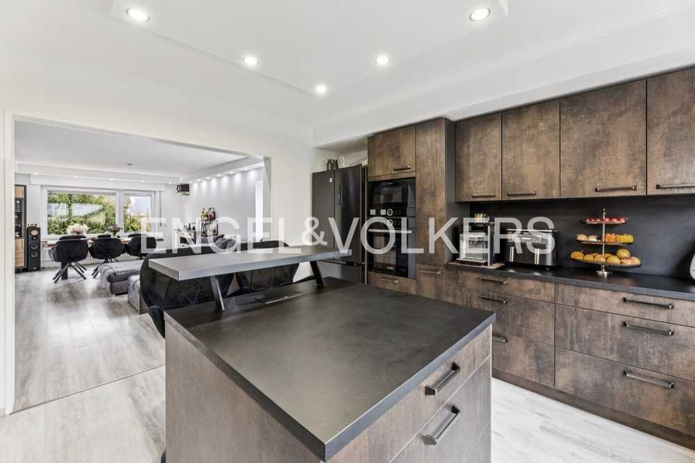 Die erste Wohneinheit liegt im Erdgeschoss (Hochparterre) und bietet auf ca. 100 m² Wohnfläche einen großzügigen Wohn- und Essbereich mit direktem Zugang zur Terrasse und zum gepflegten Garten. Die modern gestaltete Einbauküche ergänzt den Wohnbereich perfekt. Zwei Schlafzimmer, ein Tageslichtbad mit bodengleicher Dusche sowie ein großer Abstellraum und eine praktische Speisekammer runden das Raumangebot ab.