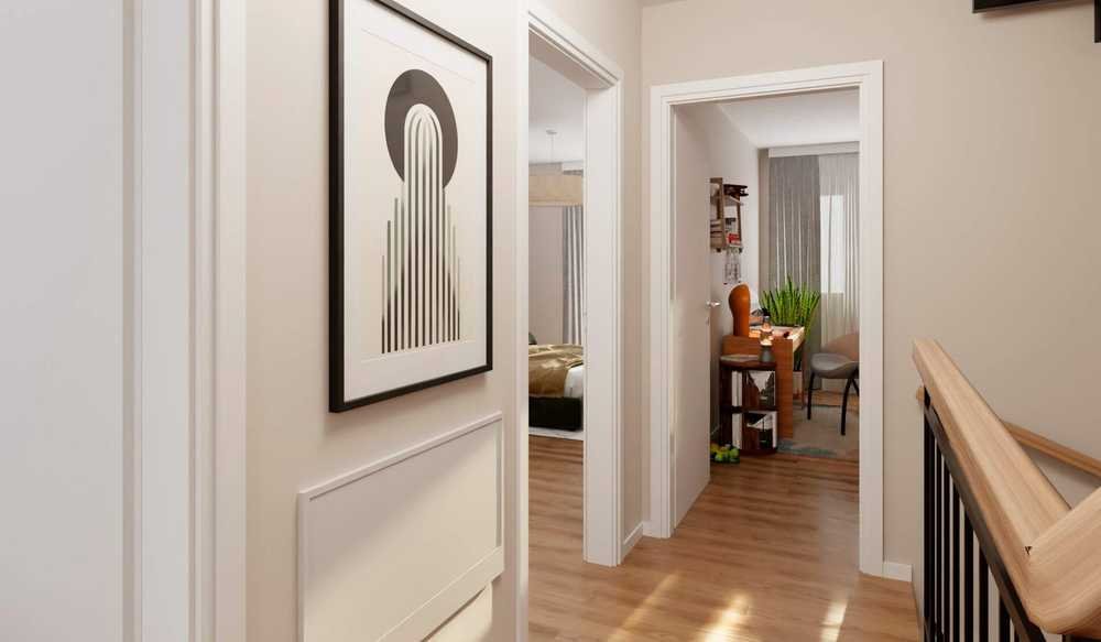 Beim Betreten des Erdgeschosses Ihres neuen Zuhauses empfängt Sie ein einladender Wohnbereich, der mit einer offenen Küche verbunden ist. Die Terrasse bietet zusätzlichen Raum für gemütliche Stunden im Freien. Praktische Räume wie ein Hauswirtschaftsraum und ein Gäste-WC sind ebenfalls vorhanden. Im Obergeschoss finden Sie das geräumige Schlafzimmer mit Ankleide und zwei Kinderzimmer. Das Badezimmer bietet sowohl Dusche als auch Badewanne. Die Dachterrasse ist ein Highlight für entspannte Stunden und bietet viel Platz zum Entspannen.