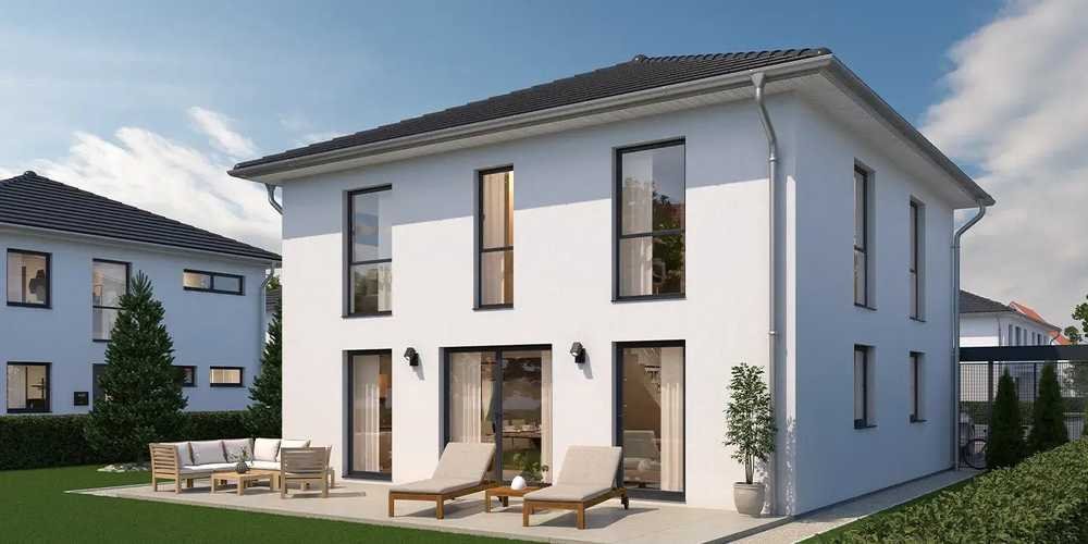 Zwei Vollgeschosse ohne Dachschrägen garantieren eine optimale Raumausnutzung, klare Strukturen und ein modernes, offenes Wohngefühl.