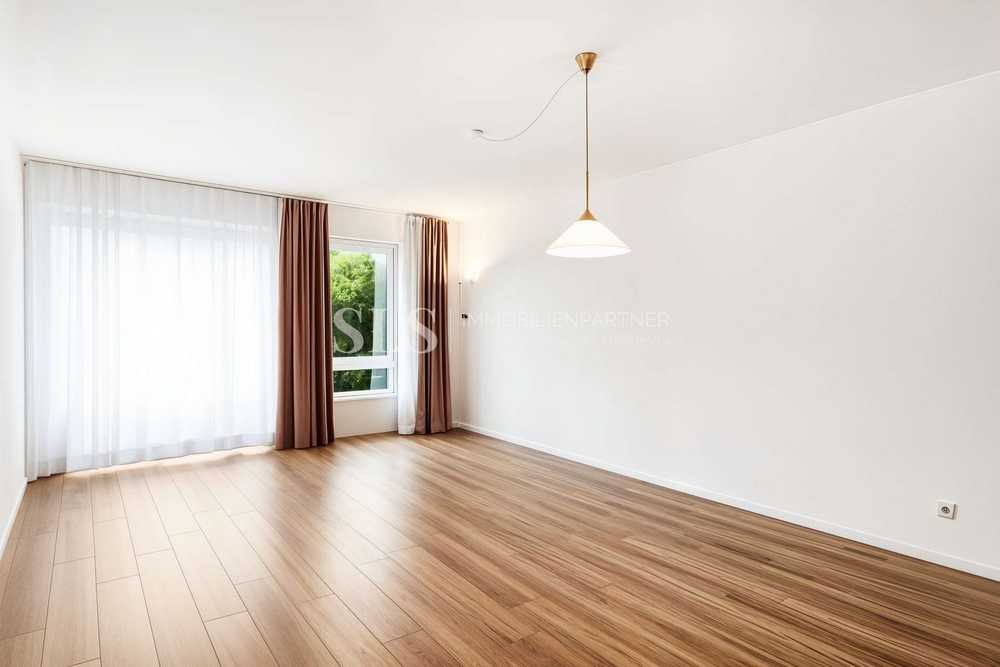 Der Wohn- und Essbereich bildet das Herzstück der Wohnung und ist durch die großen Fenster angenehm lichtdurchflutet. Von hier aus erreichen Sie den überdachten Balkon, der einen erholsamen Blick ins Grüne bietet – perfekt, um den Feierabend entspannt ausklingen zu lassen.