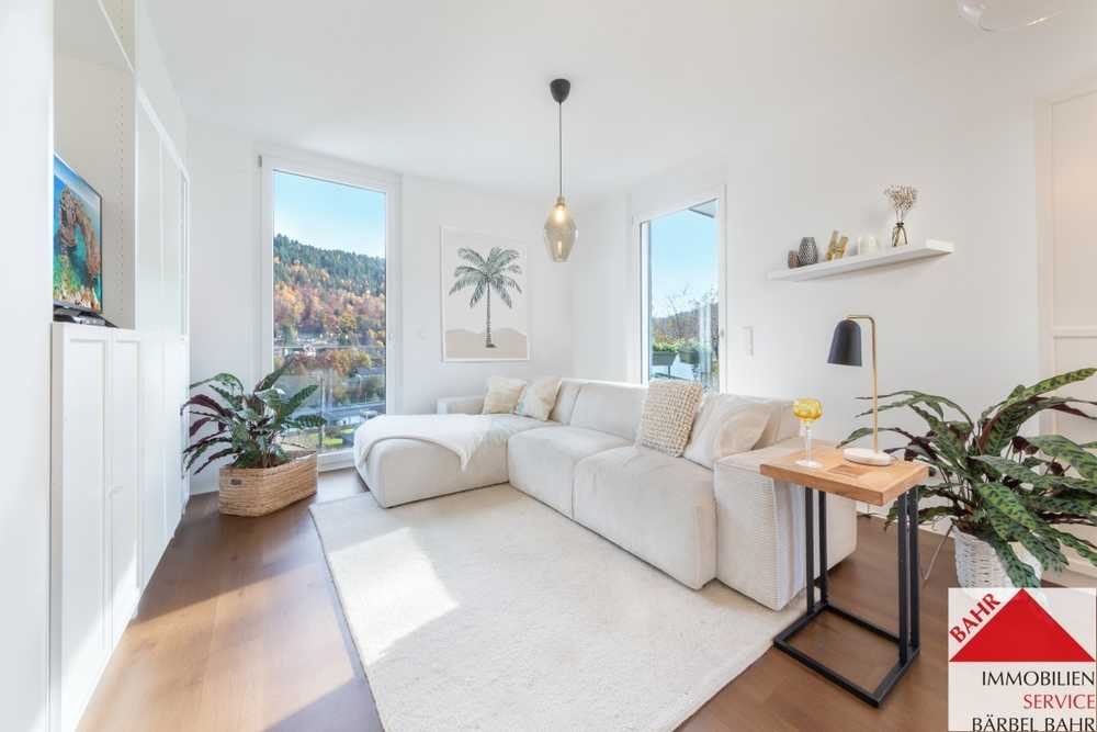 Der offene, helle Wohnbereich beeindruckt mit bodentiefen Fenstern, die den Raum mit natürlichem Tageslicht durchfluten und einen schönen Ausblick bieten. Direkt angrenzend befindet sich die moderne, gut ausgestattete Küche, die mit reichlich Stauraum und großzügigen Arbeitsflächen überzeugt.