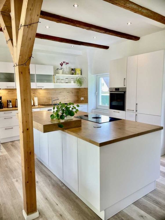 Im Hausinneren erwartet Sie eine großzügige Wohnküche aus dem Jahr 2020. Unter anderem ein Bora-Kochfeld mit integriertem Dunstabzug, ein Neff-Backofen mit versenkbarer Tür sowie zwei Apothekerschränke für großzügigen Stauraum machen diese Küche zu einem Ort, an dem das Kochen Freude macht. Die Kochinsel mit Tresen bietet viel Platz, damit Sie mit der gesamten Familie oder Freunden gemeinsam kochen und genießen können.