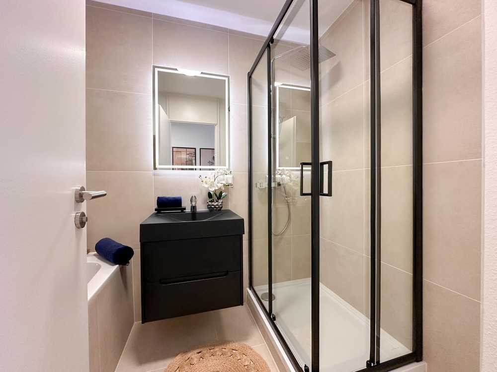 Das modern ausgestattete Badezimmer überzeugt mit separater Dusche und Badewanne - perfekt für barrierefreies Wohnen und täglichen Komfort.