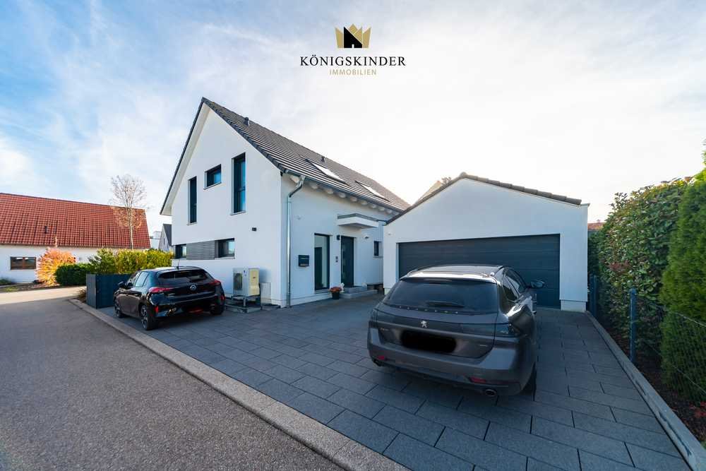 Das Haus verfügt über drei Bäder und eine hochwertige, offene Einbauküche, die Funktionalität und Stil vereinen. Eine großzügige Doppelgarage sowie ein separater Stellplatz bieten ausreichend Platz für Fahrzeuge und Abstellbedarf. Zusätzlich sorgt eine Luft-Wärme-Pumpe für effiziente Heizung und Warmwasserbereitung. Insgesamt verbindet das Haus moderne Technik, bauphysikalische Qualität und eine anspruchsvolle Innenraumgestaltung zu einem zeitlosen Wohnkonzept.