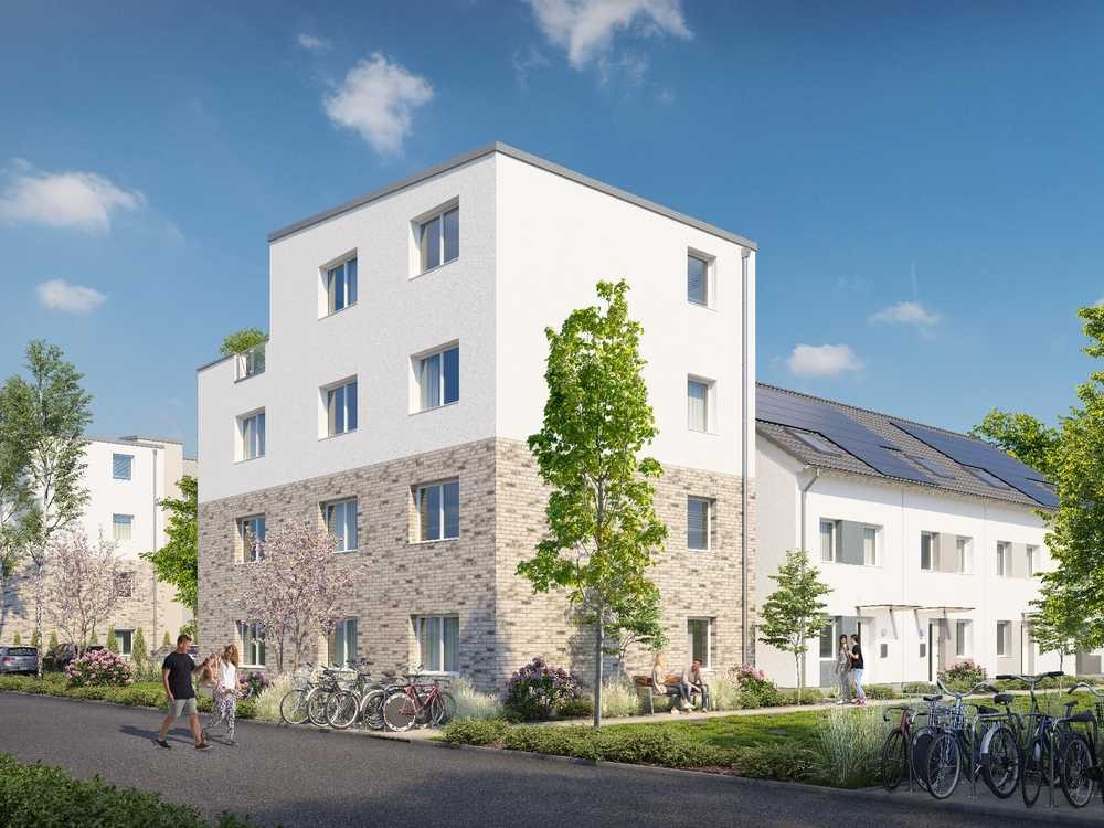 Die umliegenden PKW-Stellplätze sorgen für kurze Wege. Gemeinschaftliche Fahrrad- und Mülleinhausungen, Fahrradflächen für Besucher und Stellmöglichkeiten für Lastenräder runden das moderne Wohnensemble gelungen ab.