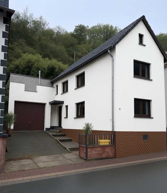 Das gezeigte Bild der Aussenfassade wurde mithilfe von KI erstellt und zeigt eine Vorschau der Fassade nach dem Verputzen und weißen Anstrich. Alle anderen Bildelemente sind unverändert.