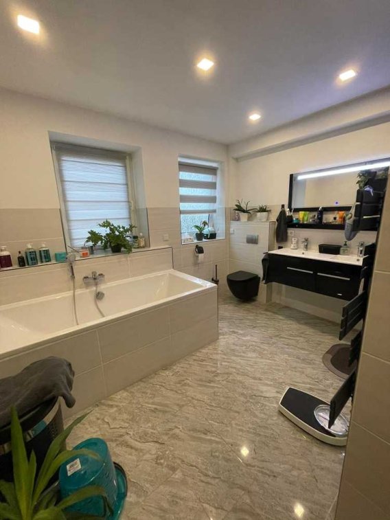 Die Immobilie verfügt über drei Tageslichtbäder, die jeweils mit Badewanne oder Dusche ausgestattet sind und den Komfort eines modernen Wohnens bieten. Für zusätzlichen Stauraum sorgt ein Abstellraum sowie ein Hauswirtschaftsraum (HWR), die praktische Lösungen im Alltag ermöglichen. Besonders hervorzuheben ist die großzügige Sonnenterrasse, die durch den wertvollen Baumbestand natürlichen Schatten spendet und zum Entspannen im Freien einlädt.