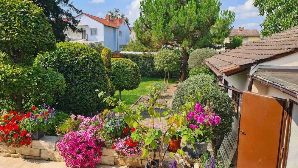 Der liebevoll angelegte Garten bietet hohe Bäume, die Schatten und Privatsphäre spenden. Neben einem kleinen Nutzgarten gibt es eine großzügige Rasenfläche, Blumenbeete, Sträucher und Wege. Dank der Grundstücksgröße sind auch Sauna oder Pool realisierbar. Eine große Terrasse sowie ein Freisitz im Garten laden zum Entspannen und Feiern ein.