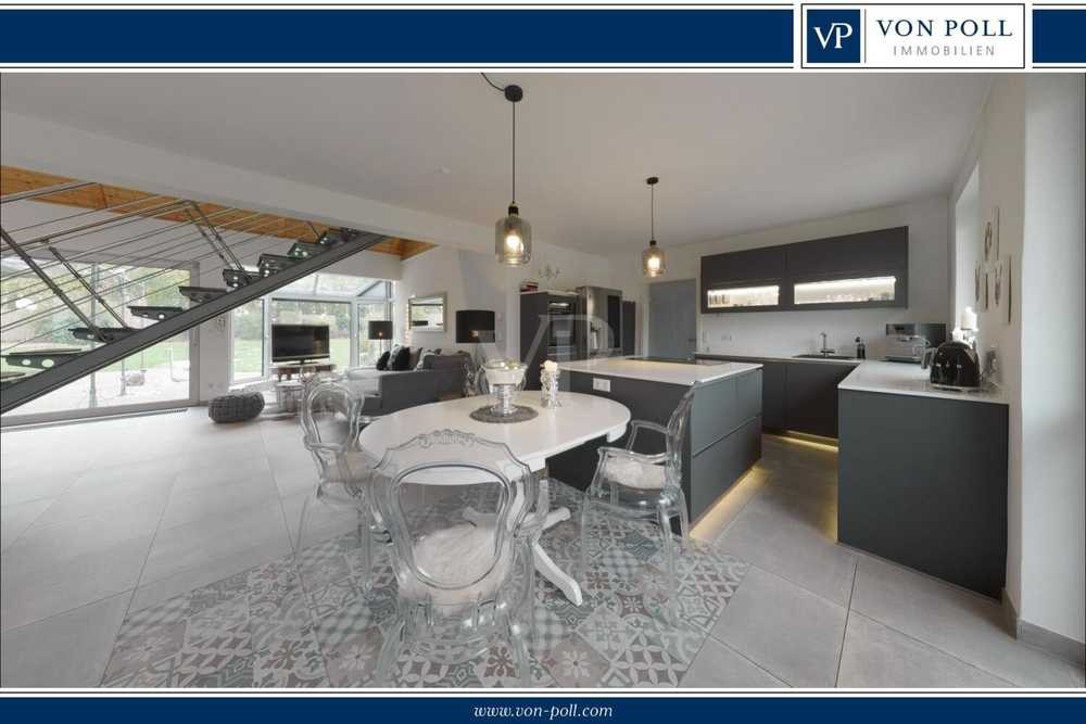 Die neuwertige Küche aus dem Jahr 2021 wurde mit hochwertigen Geräten ausgestattet und grenzt direkt an den Hauswirtschaftsraum, der einen praktischen Zugang zur geräumigen Doppelgarage bietet. Besonders hervorzuheben ist die imposante Galerie, die mit eingelassenen Glasböden einen einzigartigen Blick in das Erdgeschoss ermöglicht und die beeindruckende Architektur des Hauses unterstreicht.