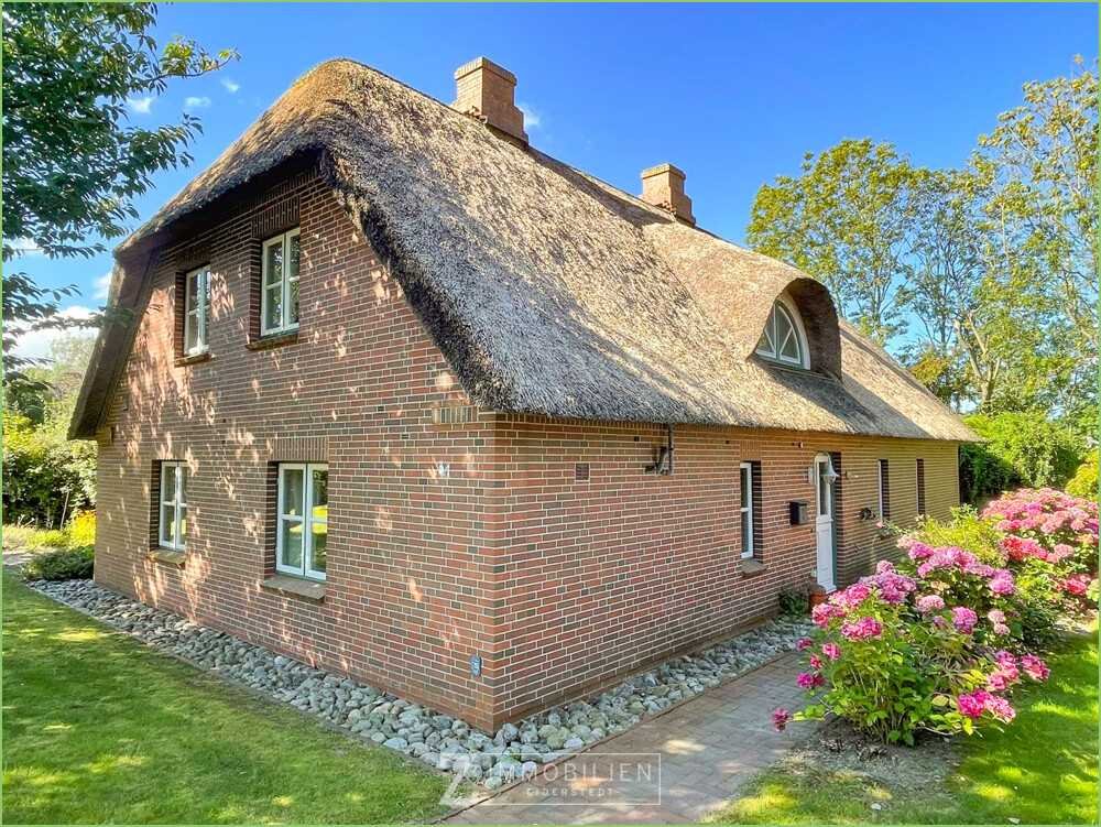 Dieses charmante Reetdachhaus aus dem Jahr 1995 liegt idyllisch im ruhigen Wasserkoog auf der Halbinsel Eiderstedt. Auf einem ca. 1.200 m² großen Grundstück bietet es eine Größe von ca. 174m², die sich auf zwei Etagen verteilen. Die gemütliche Ausstattung mit Kachelofen, offener Holzbalkendecke und Holzsprossenfenstern unterstreicht den norddeutschen Landhausstil.
