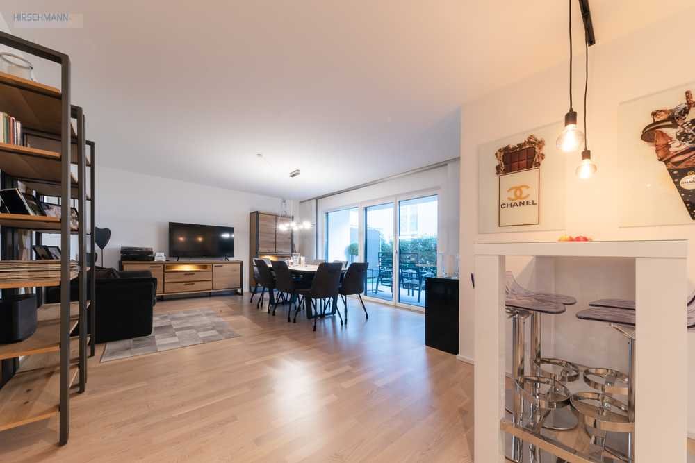 Der großzügige Wohn- und Essbereich mit offener Küche bildet das kommunikative Zentrum der Wohnung. Weitläufige Fensterfronten mit elektrischen Rollläden sorgen für eine helle, einladende Atmosphäre und eröffnen zugleich den Zugang zur Terrasse und dem gepflegten Garten – ein privater Rückzugsort, der den Wohnraum erlebbar nach draußen erweitert.