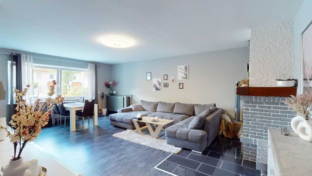 Das Herzstück der Wohnung ist der großzügige Wohn- und Essbereich mit Kamin, der eine warme und gemütliche Atmosphäre schafft – ideal für entspannte Abende mit Familie oder Freunden.