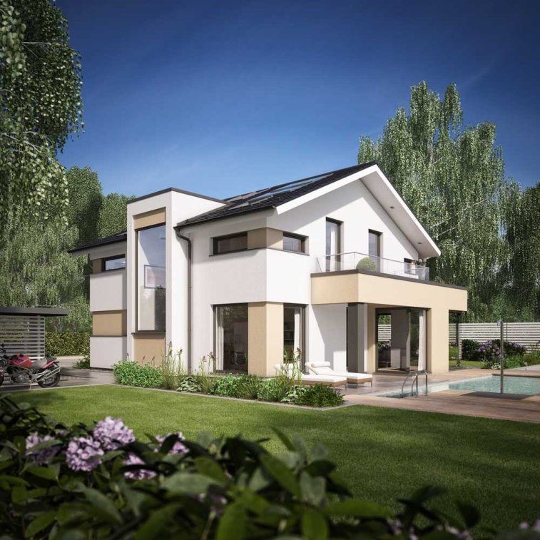 Das Einfamilienhaus CONCEPT-M 153 besticht durch seine durchdachte Architektur und die harmonische Verbindung von Stil und Funktionalität. Mit einer großzügigen Wohnfläche von 153 m² und einer Grundstücksgröße von 535 m² bietet dieses Haus ein ideales Zuhause für Familien, die Wert auf ein modernes Wohnkonzept legen. Die offene Gestaltung der Räume schafft eine lichtdurchflutete Atmosphäre, während der clevere Grundriss eine optimale Nutzung der Fläche gewährleistet. Die einladende Diele fungiert als zentrales Bindeglied zwischen den einzelnen Bereichen. Hier finden Sie nicht nur die Haustechnik, sondern auch ein praktisches Gäste-WC, ein Arbeitszimmer sowie eine Garderobe. Die angrenzende Küche mit Speisekammer öffnet sich zum großzügigen Wohn- und Essbereich, der zu geselligen Abenden mit Familie und Freunden einlädt. Zudem sorgen große Fenster für ein angenehmes Lichtspiel und eine Verbindung zur Natur.
