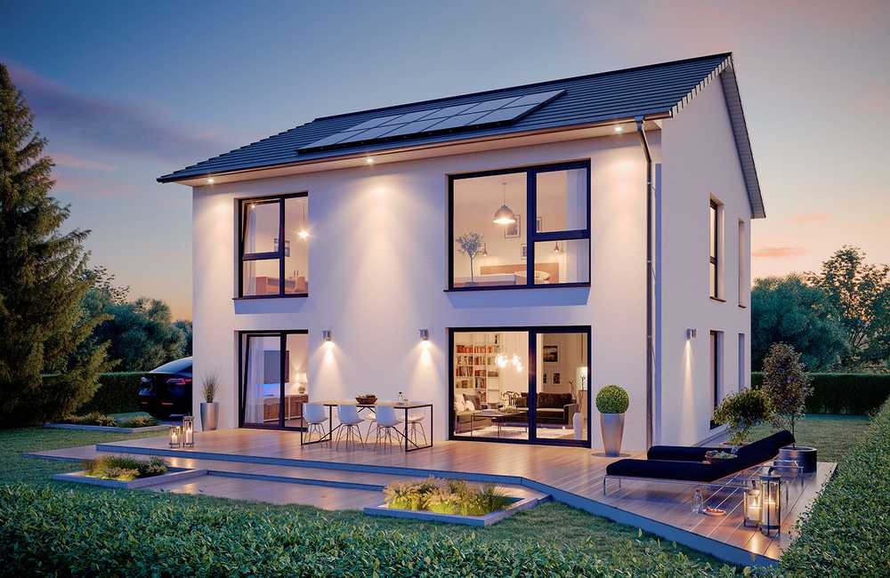 Erleben Sie urbanes Wohnen auf höchstem Niveau – die Stadtvilla SH 200 S ist das perfekte Zuhause für anspruchsvolle Familien. Mit zwei Vollgeschossen und großen modernen Fensterelementen, die für viel Tageslicht und ein helles Ambiente sorgen, ist diese Villa ein Traum für alle, die modernes Wohnen lieben. Die große Diele mit Zugang zur Treppe in der Mitte des Raumes ist ein echtes Highlight und verbindet die beiden Etagen perfekt miteinander. Umlaufend können Sie sich Ihre Wohnlandschaft, einen Lesebereich, einen schönen großen Essplatz und natürlich die Küche gestalten. Ein Zimmer im Erdgeschoss kann als Gästezimmer genutzt werden – gegenüber liegt gleich ein kleines Gäste-Bad mit Duschlösung. Daneben fügt sich noch der Hauswirtschaftsraum auf dieser Ebene ein. Im Obergeschoss bieten zwei Bereiche viel Platz für die ganze Familie. Einen besonderen luxuriösen Eindruck hinterlässt das Master-Schlafzimmer mit räumlich separater Ankleide und dahinter liegendem Bad – alles vereint in einer Einheit mit einem Zugang. Die beiden weiteren Zimmer teilen sich ein eigenes Bad. Ein Absteller zwischen den beiden Zimmern schafft Platz für Kleidung und ermöglicht mehr Freiraum in den Zimmern. Mit einer Wohnfläche von 200 m² bietet diese Stadtvilla unter einem Walmdach genug Raum für individuelle Wohnideen und lässt keine Wünsche offen.