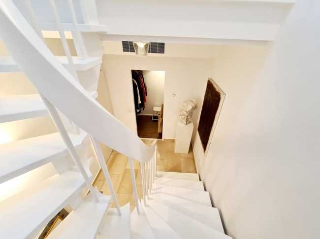 Eine Treppe mit Massivholz-Stufen führt vom Eingangsbereich in die obere Ebene der Wohnung. Hier befindet sich ein großes, lichtdurchflutetes Wohn-/Esszimmer mit offenem Küchenbereich. Eine Bulthaup Einbauküche mit Miele Geräten und Bora Abzugssystem lädt zum Kochen ein. Die hohen Decken, das tolle Lichtkonzept und die großen Fensterflächen, vermitteln ein Gefühl von Luftigkeit, Helligkeit und Großzügigkeit. Mit wunderbarem Blick auf den Taunus, können Sie auf dem großen, nach Westen ausgerichteten Balkon bei einem Glas Wein den Tag entspannt ausklingen lassen.