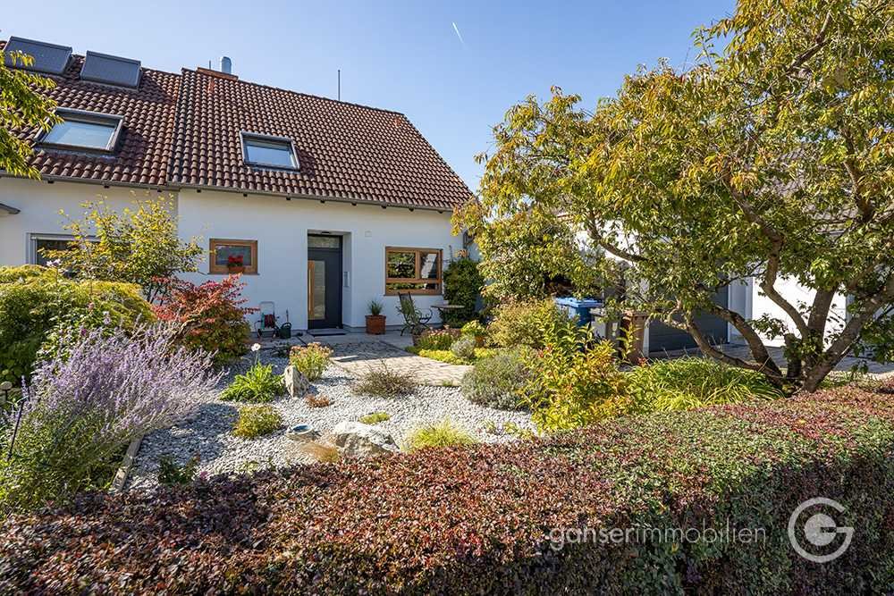 Es handelt sich um das rechte Endhaus von drei Häusern in Reihe. Architektonisch hat man nicht den Eindruck vor Reihenhäusern zu stehen. Straßenseitig sind diese sehr individuell gestaltet. Durch das sehr breite Endgrundstück findet die Garage neben dem Haus ihren Platz.