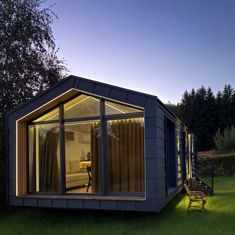 Die winterfeste Bauweise mit EH55 Effizienzstandard, elektrischer Fußbodenheizung, moderner Dämmung, einem effizienten Lüftungssystem und pflegeleichten Außenmaterialien sorgt für hohen Wohnkomfort und niedrige Betriebskosten. Innen bietet das Haus eine moderne Einbauküche mit Induktion, Backofen und Kühlschrank, einen hellen Wohn und Essbereich mit großer Fensterfront, zwei vollwertige Schlafzimmer, ein stilvolles Bad mit 90x90 Dusche sowie eine moderne Elektroinstallation. Außen überzeugt die wartungsarme Fassade in Anthrazit, das integrierte Fahrgestell und das zeitlose Design.