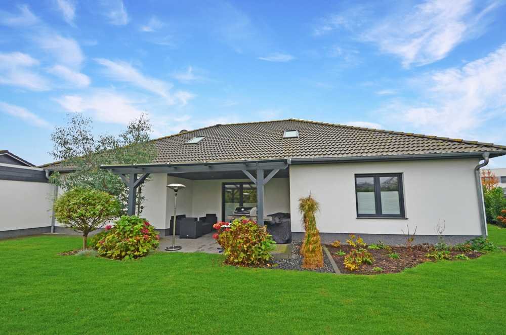 Konzipiert zum Leben - in ihm wohnen ist einfach großartig. Der in Massivbauweise erstellte, moderne Bungalow ist ein echtes Multitalent. Ob Familien mit Kindern, Paare mit Home-Office und Hobbies oder Best-Ager - für alle-(s) ist gesorgt. Im Erdgeschoss wird großzügig auf ca. 150 m² mit fünf Zimmern gewohnt. Sinnvolle Raumkonzepte stehen im Einklang mit ausgewählten, hochwertigen Materialien. So heißt Sie ein geräumiges Entrée mit Zugang zum Gäste-WC und Büro (Glasfaser vorhanden) willkommen. Der Hauswirtschaftsraum punktet nicht nur mit seinen ca. 14 m², sondern auch mit direktem Zugang zur Doppelgarage, selbstverständlich mit Sektionaltor und einem praktischen Geräteraum, perfekt zum Einrichten Ihrer Werkstatt oder der eigenen Sauna. Mit wahrer Größe verschmelzen Wohnen, Essen und Kochen zu einem harmonischen Ganzen von ca. 43 m². Eine schicke, hochwertige Einbauküche haben die Mieter eingebaut. Sie kann bei Bedarf von ihnen übernommen werden. Ums Eck finden Sie in drei weiteren Zimmern Ihre persönlichen Rückzugsorte und das stattliche Familienbad mit Badewanne und Dusche. Eigentlich wäre, wie üblich bei Bungalows, jetzt alles über die Innenräume erzählt - nicht aber bei diesem besonderem Schmuckstück. Im Dachgeschoss (Stahlbetondecke verbaut) wartet ein exklusives Studio auf Ihre Wohnideen. Jetzt wird es als Sport-, und Wellnessbereich mit Sauna und Dusche genutzt. Es bietet aber ebenso Potential für den Ausbau zweier weiterer Räume mit Duschbad. Was sind Ihre Wünsche? Bei der Umsetzung unterstützt Sie der Eigentümer gern. Modern und alltagstauglich ist der Außenbereich gestaltet. Hecken und Gräser rahmen das Grün geschmackvoll ein und bieten Privatsphäre. Auf der überdachten Terrasse macht auch das Wintergrillen noch Freude. Spielgeräte für die Kinder oder Ihre zukünftigen Hochbeete finden hier noch problemlos ihren Platz, ebenso das Gartenhaus.