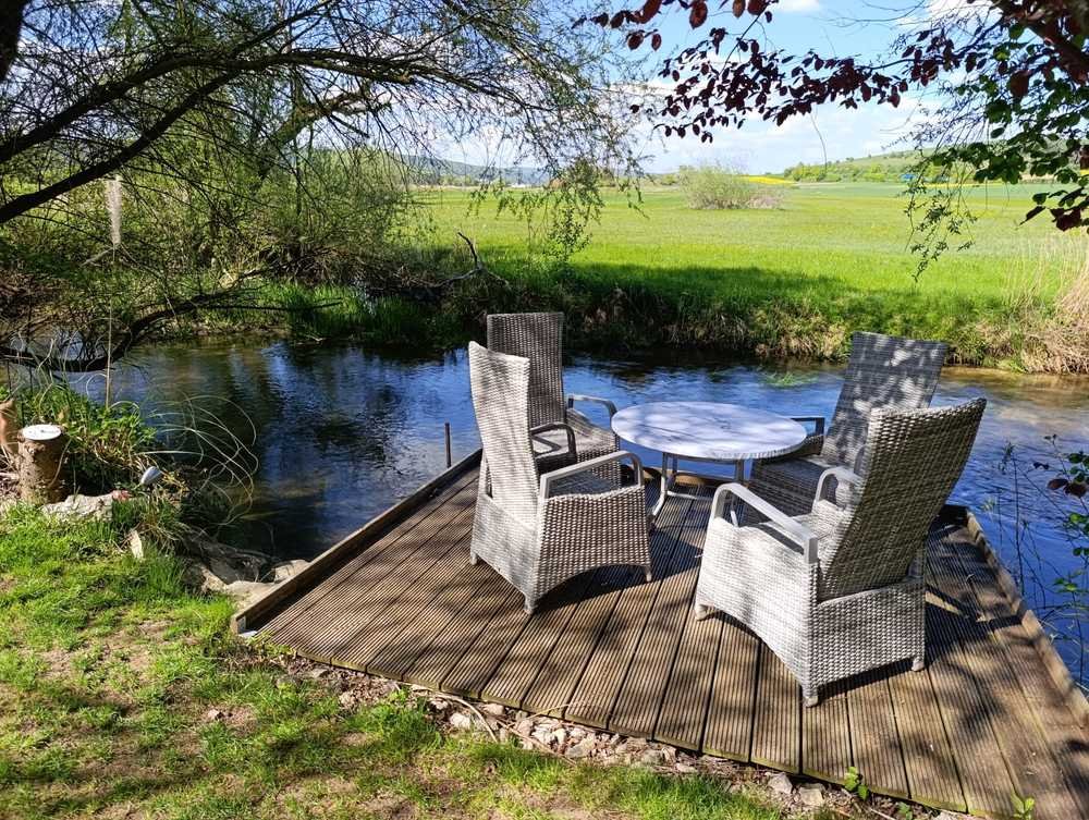 Der schön angelegte Garten bietet zahlreiche Rückzugsmöglichkeiten und direkten Zugang zur Schmiech.
