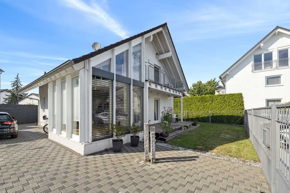 Dieses moderne Einfamilienhaus mit einer Wohnfläche von rund 179 Quadratmetern präsentiert sich in einem nahezu neuwertigen Zustand und begeistert durch seine außergewöhnliche Ausstattungsqualität sowie eine lichtdurchflutete Architektur, die eine besondere Wohnatmosphäre schafft. Große Fensterflächen, insbesondere im weitläufigen Wohn- und Essbereich, öffnen den Blick ins Freie und sorgen den ganzen Tag für eine helle, freundliche Stimmung. Der zentrale Wohn-/Essbereich ist das Herzstück des Hauses: Offen gestaltet, großzügig dimensioniert und durch eine Galerie optisch mit dem darüberliegenden Büro im ersten Obergeschoss verbunden. Dieser architektonische Kniff schafft ein beeindruckendes Raumgefühl und wirkt repräsentativ wie gemütlich zugleich. Die angrenzende Küche ist ebenfalls ein Highlight – modern, geräumig und mit hochwertiger Ausstattung versehen. Ihre klare Linienführung und die durchdachte Arbeitsfläche ermöglichen entspanntes Kochen auf hohem Niveau. Im Erdgeschoss steht zudem ein geschmackvoll gestaltetes Gäste-Bad zur Verfügung. Die Außenbereiche des Hauses laden zum Entspannen und Genießen ein: Eine sonnige Terrasse, ein eigener Pool und ein fest integrierter Grillplatz schaffen den perfekten Rahmen für private Auszeiten und gesellige Stunden mit Familie und Freunden. Der Balkon erweitert den Wohnraum zusätzlich nach draußen und bietet attraktive Rückzugsorte. Der Keller des Hauses ist teilweise als Wohnebene ausgeführt und überzeugt mit einem durchdachten Raumkonzept. Hier befindet sich das großzügige Hauptschlafzimmer inklusive Ankleideraum, das viel Stauraum und Komfort bietet. Ein weiteres Highlight ist das eigene Fitnesszimmer – ideal für alle, die Wert auf einen gesunden Lebensstil legen. Der restliche Keller dient als klassischer Nutz- und Abstellbereich für Vorräte, Technik und Ordnung. Im ersten Obergeschoss stehen zwei gut geschnittene Kinderzimmer zur Verfügung, die flexibel genutzt werden können – als Schlafräume, Spielzimmer oder kreative Lernorte. Ein modernes Badezimmer ergänzt diese Ebene. Zusätzlich befindet sich hier das offene Büro, das über die Galerie eindrucksvoll mit dem Wohnbereich verbunden ist und eine luftige, inspirierende Arbeitsatmosphäre bietet. Das gesamte Haus vermittelt den Eindruck eines frisch bezogenen, sehr liebevoll gepflegten Zuhauses. Moderne Materialien, hochwertige Technik und ein zeitloser Stil machen die Immobilie zu einem Objekt, in das man sprichwörtlich sofort einziehen und sich rundum wohlfühlen kann.