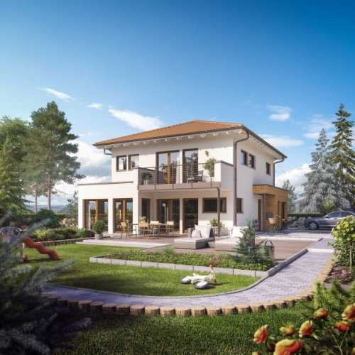Modernes Walmdachhaus mit zwei Übereck-Erkern, Freisitz und Balkon
