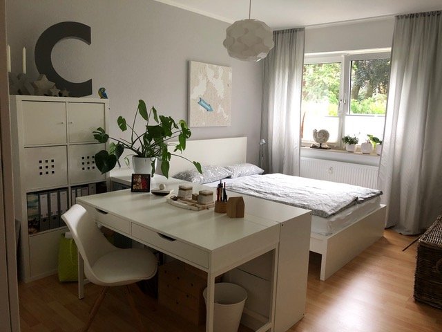 Die Wohnung besteht aus 1 Schlaf- und 1 Wohnzimmer mit offener Küche. Die Fronten der hochwertigen EBK (von 2015) sind Hochglanz weiß. Die Küche verfügt über 1 Backofen mit Ceranfeld, 1 Dunstabzugshaube (Umluft), 1 Kühlschrank mit integriertem Gefrierfach, 1 Geschirrspüler. Im Flur ist ein Einbauschrank, der sich gut als Vorratsschrank eignet. In beiden Zimmern ist Laminat, Bad und Flur sind gefliest. Das Bad verfügt über 1 ebenerdige Dusche, 1 Handtuchheizung und 1 Waschmaschinenanschluss. Vor dem Wohnzimmer befindet sich ein großer Balkon mit Markise mit tollem Blick in den Vorgarten. Alle Fenster verfügen über Außenjalousien. Die Wohnung wurde 2012 umfassend renoviert und modernisiert. Hierbei wurde die Küche zum Wohnzimmer hin geöffnet und ein Stahlträger eingezogen. Auch das Bad wurde komplett erneuert und auf seinen heutigen modernen Stand umgebaut. Zur Wohnung gehört zudem ein Tiefgaragenstellplatz mit vorgerichtetem Wallboxanschluss. Weiterhin gehört dazu 1 Abstellraum im DG. Das Hausgeld beträgt aktuell 369 EUR. Die Wohnung war bislang durchgehend gut vermietet. Derzeit wird ein Quadratmeterpreis von 12,60 EUR zzgl. Nebenkosten erzielt. Die Eigentümergemeinschaft besteht aus 36 Parteien und ist unkompliziert, die Verwaltung arbeitet seit Jahren sehr effizient und zur Zufriedenheit aller. Die Wohnung ist seit 01.07.2024 befristet vermietet. Ein Auszug des Mieters ist in Absprache kurzfristig möglich. Die Fotos zeigen den Einrichtungsstand eines früheren Mieters.