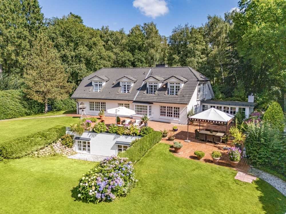 Am Ende einer Privatstraße, direkt am Forst Klövensteen: Dieses großzügige Anwesen verbindet maximale Ruhe und Sicherheit mit kurzer, komfortabler Anbindung an die Hamburger City. Weitläufige Wohn- und Außenbereiche, exzellente Technik und eine separate Einliegerwohnung machen es zum idealen Familiensitz – für alle, die Natur schätzen und das kulturelle Leben Hamburgs nicht missen wollen. Schon die Ankunft hat besonderen Charakter: Ein individuell geschmiedetes, gusseisernes Tor öffnet die lange Auffahrt, gesäumt von prachtvollen Rhododendren, die das Anwesen wie einen grünen Rahmen umgeben. Der parkähnliche Garten mit direktem Zugang zum Forst Klövensteen verbindet Großzügigkeit mit außergewöhnlicher Ruhe und bietet ganztätig Sonne. Das Haus selbst kombiniert Weitläufigkeit und Geborgenheit: Beim Eintreten eröffnet das großzügige Entrée mit eleganter Wendeltreppe eine besondere Atmosphäre. Der offene Rundlauf im Erdgeschoss verbindet die hellen Wohnräume mit Blick ins Grüne. Ein beheizter Wintergarten mit Kamin und die einladende Terrasse bieten den idealen Rahmen – sowohl für festliche Anlässe als auch für entspannte Abende im kleinen Kreis. Der kommunikative Mittelpunkt des Hauses bildet die Küche mit angrenzendem Essbereich mit kurzen Wegen in den Garten. Ergänzt wird das Erdgeschoss durch zwei zusätzliche Räume, die sich flexibel als repräsentatives Homeoffice oder geschmackvolles Gästezimmer nutzen lassen. Im Obergeschoss überzeugen ein Master-Bedroom mit Bad en suite, zwei weitere Schlafzimmer mit eigenem Vollbad sowie mehrere Balkone mit herrlichem Blick. Hochwertige Einbauten und ein separates Ankleidezimmer unterstreichen den Wohnkomfort und setzen sich im Untergeschoss nahtlos fort: Der Wellnessbereich mit Sauna, Fitness- und Ruheräumen, ein Musikzimmer, ein großer Weinkeller, ein Waschkeller sowie vielseitige Hobby-, Vorrats- und Lagerräume sind ideale Voraussetzungen für Genuss, Freizeit und Ordnung. Ergänzt wird dieses Niveau durch eine separate Einliegerwohnung mit eigener Privatsphäre. Auch in puncto Sicherheit und Smart Living ist das Anwesen bestens ausgestattet: Ein VdS-konformes Sicherheitskonzept mit Alarmanlage, vernetzte Glas-, Bewegungs-, Rauch- und Wassermelder, Kameraüberwachung und Sicherheitsrollläden sowie ein integriertes Multiroom-Audiosystem und moderne LED-Beleuchtung lassen keine Wünsche mehr offen. Die umfassende energetische Modernisierung, inkl. leistungsstarker Erdwärmepumpe gewährleisten eine zuverlässige und wirtschaftliche Energieversorgung mit Energieeffizienzklasse A.