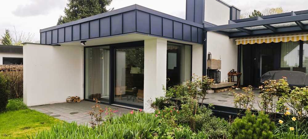 Einst für einen Augsburger Bürgermeister geplant, überzeugt der besondere Grundriss mit Split-Level-Aufteilung, lichtdurchflutetem Atrium und offenen Wohnbereichen. Die Hauptterrasse (ca. 40 m²) wurde mit einem modernen Glasdach versehen – perfekt für Frühstück im Freien und gemütliche Abende am Feuer.