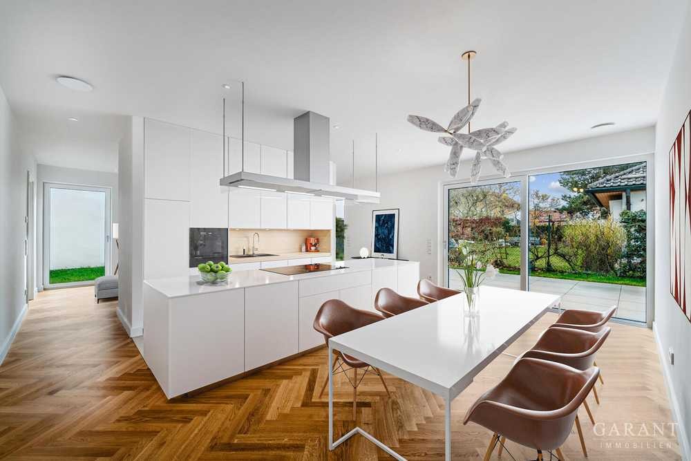 Das Herzstück des Hauses bildet der großzügige Wohn- und Essbereich mit Platz für eine offene Küche und frei stehendem Küchenblock. Große Fensterfronten mit Schiebetüren führen auf die sonnige Terrasse mit Süd-West-Ausrichtung - Ein Ort, an dem sich Alltag und Erholung vereinen.