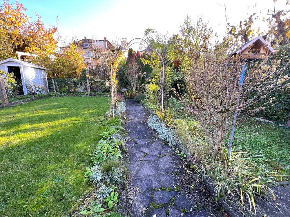 Zu diesem ansprechenden und gemütlichen Wohnhaus gehört eine schöne Sonnenterrasse mit Blick auf das romantische Grundstück. Eine traumhafte Oase, die zum Verweilen, Genießen und Erholen einlädt.