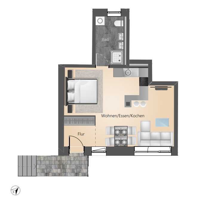 Die Wohnung bietet durch den offenen Wohn-/Ess- und Schlafbereich einen flexiblen Grundriss und eignet sich ideal für Singles oder Paare, die eine moderne und zugleich ruhige Wohnlage suchen. Dank Fußbodenheizung ist ein angenehmes Wohnklima über das gesamte Jahr hinweg gewährleistet. Ein eigener Kellerraum im Untergeschoss bietet zusätzlichen Stauraum.