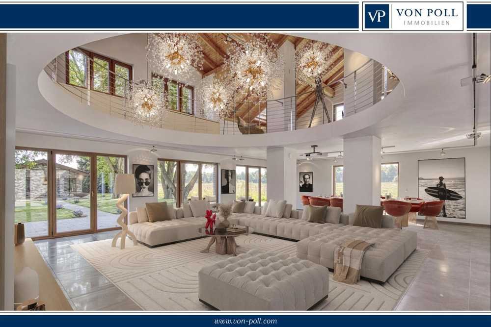 Der Wohntrakt mit seiner beeindruckenden offenen Galerie mit einer Deckenhöhe von bis zu ca. 6,60 Meter, die sich harmonisch in die Bereiche Küche, Wohnen und Essen einfügt, fasziniert jeden Besucher auf Anhieb. Die lichtdurchflutete Galerie im oberen Wohnbereich, die über eine separate Treppe zu erreichen ist, bietet eine ideale Möglichkeit zukünftig als exklusive Bibliothek oder Fitnessbereich genutzt zu werden. Der weitläufige Garten mit ca. 600 m² Rasenfläche und einer ca. 180 m² großen Terrasse lädt zum Entspannen, Verweilen und Genießen der ruhigen Atmosphäre ein.
